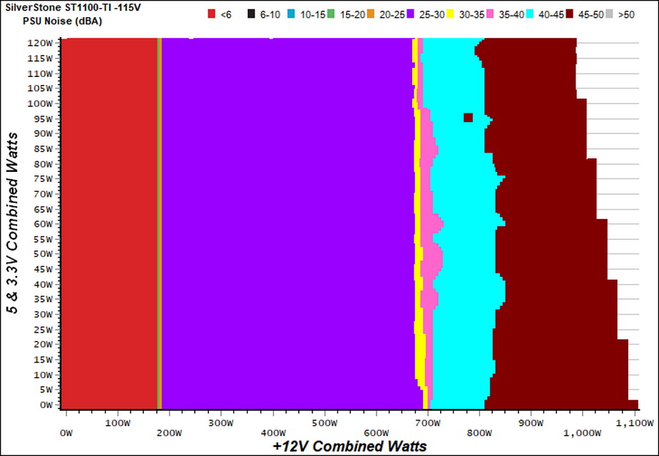 The following graph illustrates the fan's output noise over the PSU's operating range. The same conditions of the above graph apply to our measurements, though the ambient temperature is between 30°C (86°F) to 32°C (89.6°F).