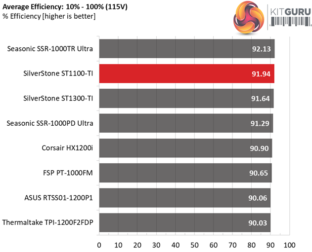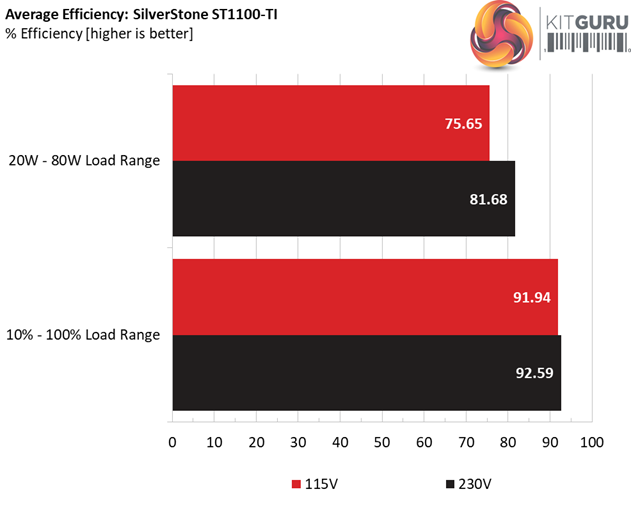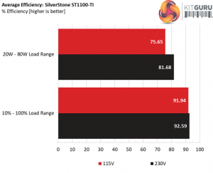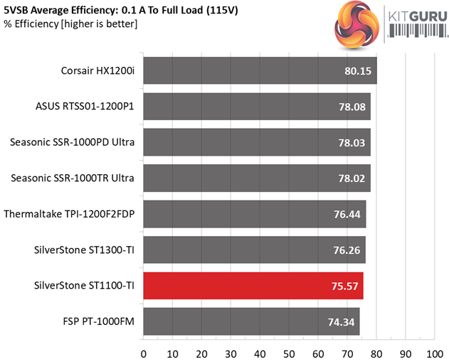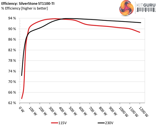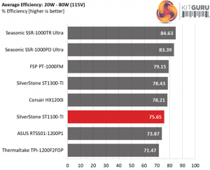 With normal loads the ST1100-TI only loses to the superb Seasonic Prime Titanium, which has 100W less capacity. The efficiency levels are not so impressive though under light loads, where SilverStone's offering comes in third place from bottom.