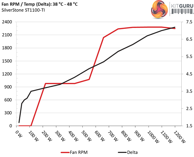 The first chart below illustrates the cooling fan's speed (in RPM), and the delta between input and output temperature. The results were obtained at 38°C (100.4°F) to 48°C (118.4°F) ambient temperature.