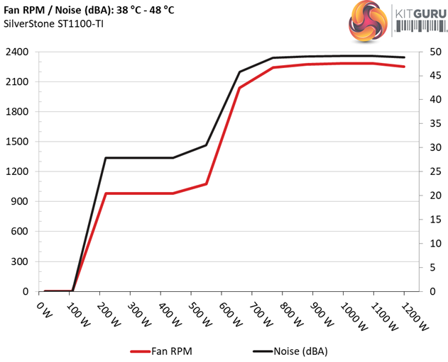 The next chart shows the cooling fan's speed (again, in RPM) and output noise. We measure acoustics from one meter away, inside a hemi-anechoic chamber. Background noise inside the chamber is below 6 dB(A) during testing (it's actually much lower, but our sound meter’s microphone hits its floor), and the results are obtained with the PSU operating at 38°C (100.4°F) to 48°C (118.4°F) ambient temperature.