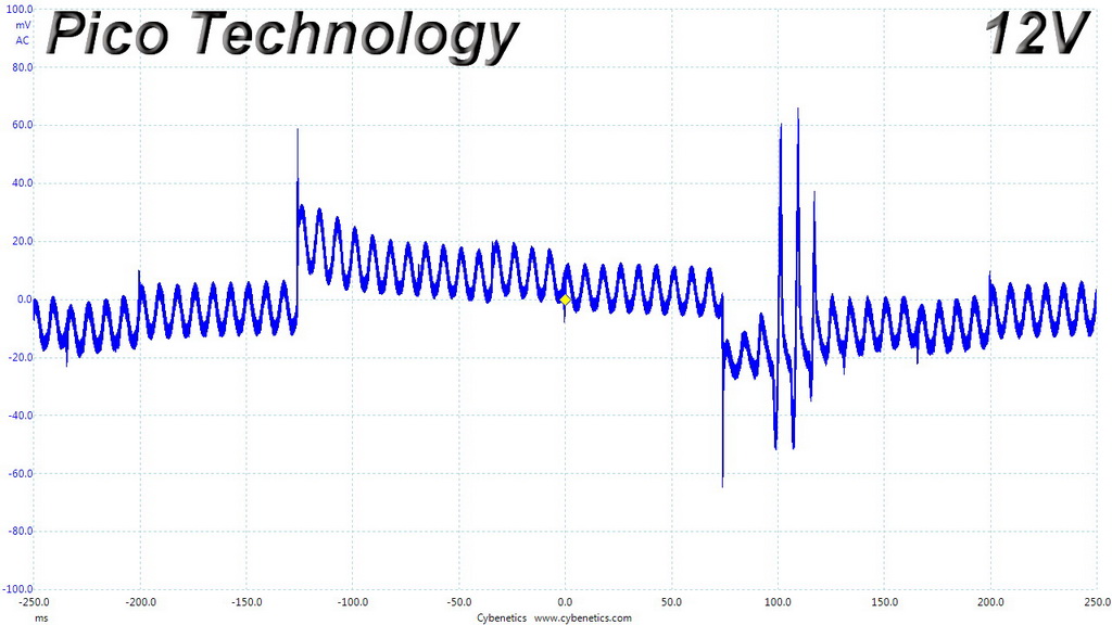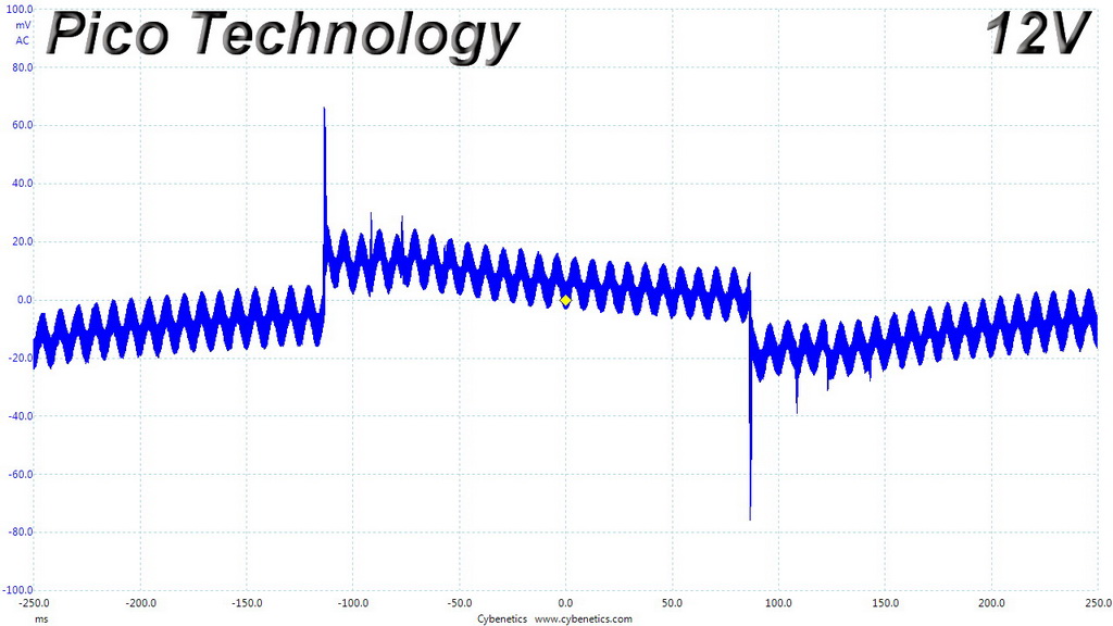 In the last test, while the PSU is completely switched off (we cut the power or switch the PSU off through its power switch), we dial the maximum load the +12V rail can handle before restoring power. The ATX specification states that recorded spikes on all rails should not exceed 10 percent of their nominal values (+10 percent for 12V is 13.2V, and 5.5V for 5V).