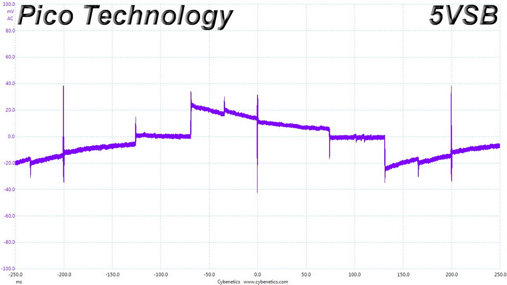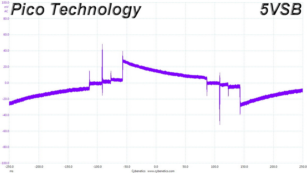 The voltage overshoot at 5VSB is notable, while in the second test the voltage overshoot is almost not existent. All hell seems to break loose in the third test, though, where we measure a huge voltage drop at +12V.