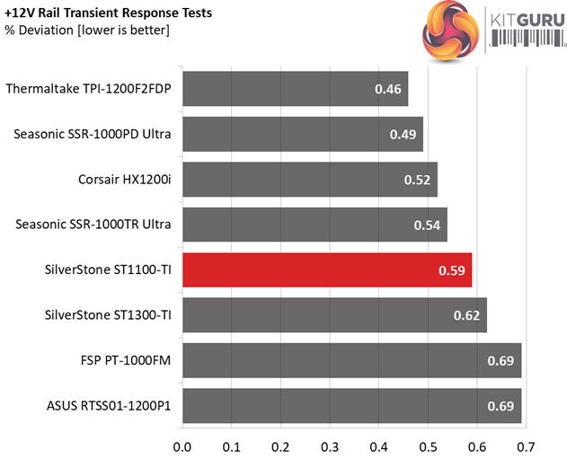The transient response of the +12V rail is good and in line with the tough competition. The 5V and 5VSB rails perform quite well, however the 3.3V rail doesn't follow and it drops its voltage very low in all of our tests, and it even fails in one of them.