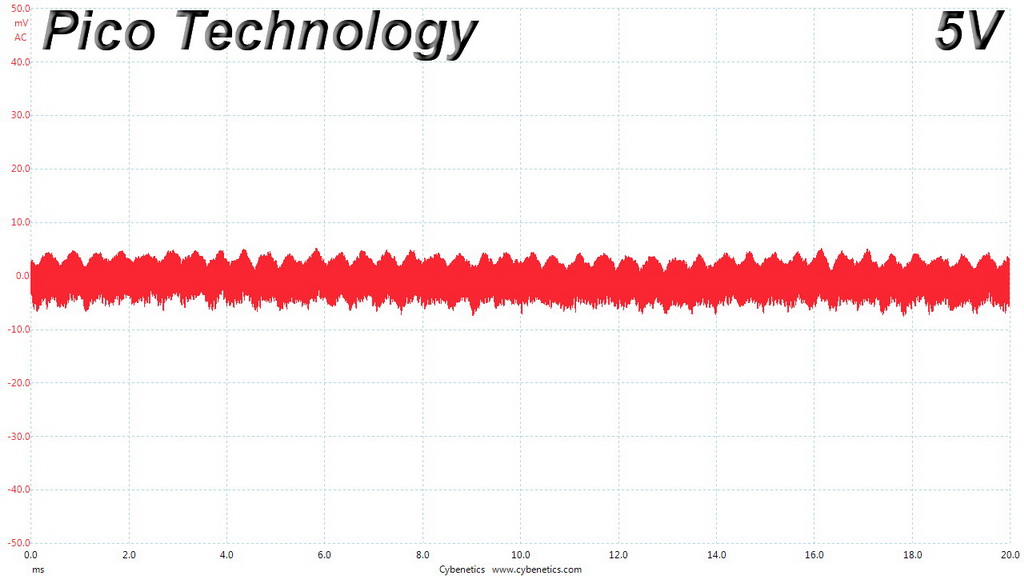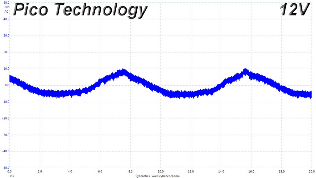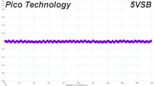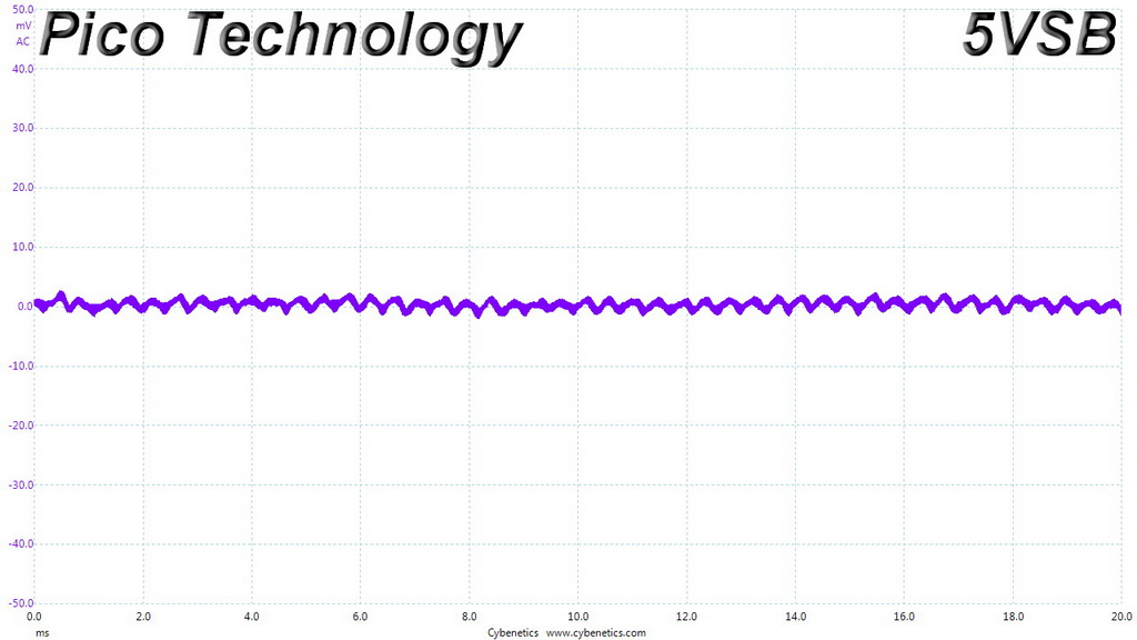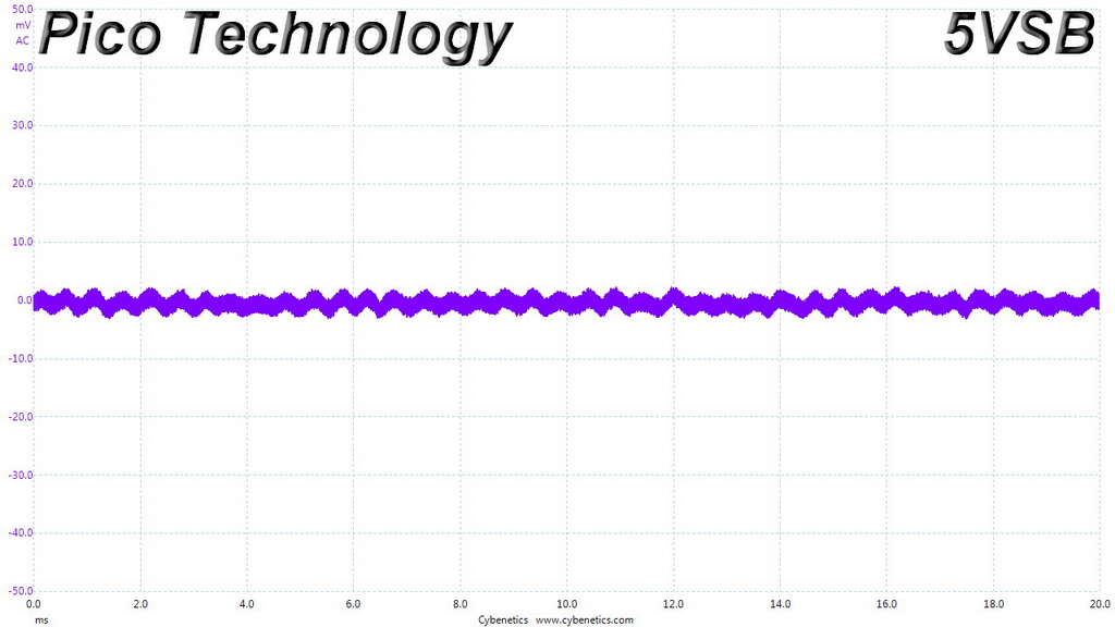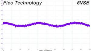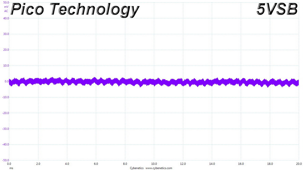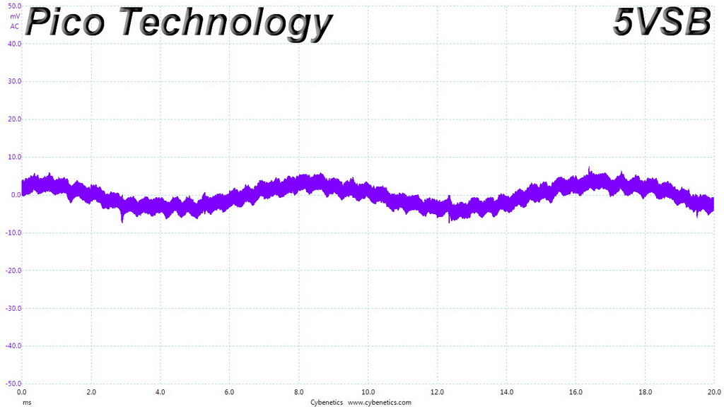 The following oscilloscope screenshots illustrate the AC ripple and noise registered on the main rails (+12V, 5V, 3.3V and 5VSB). The bigger the fluctuations on the screen, the bigger the ripple/noise. We set 0.01 V/Div (each vertical division/box equals 0.01V) as the standard for all measurements.