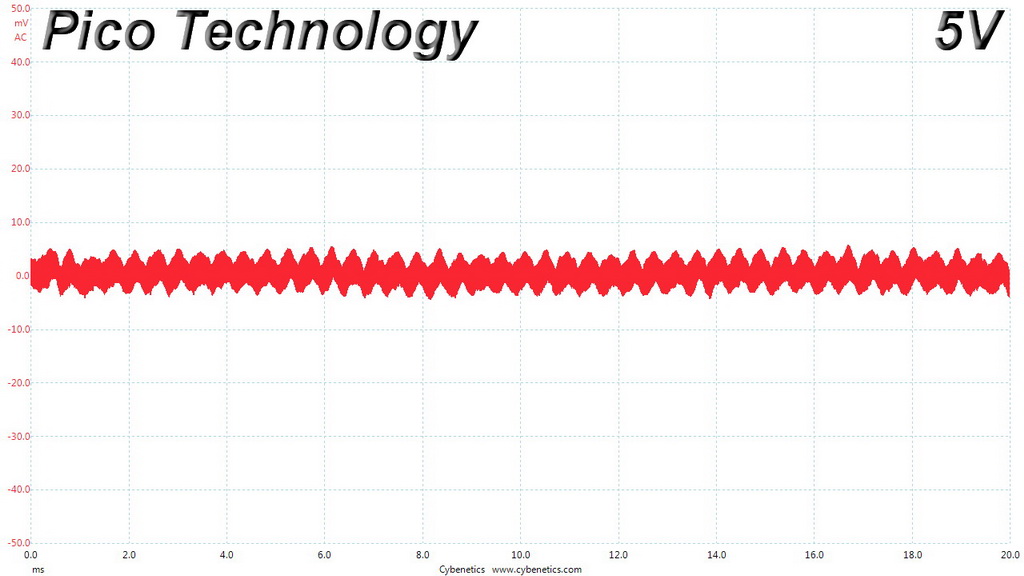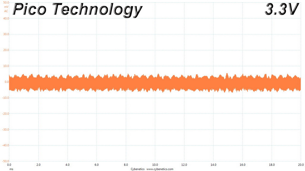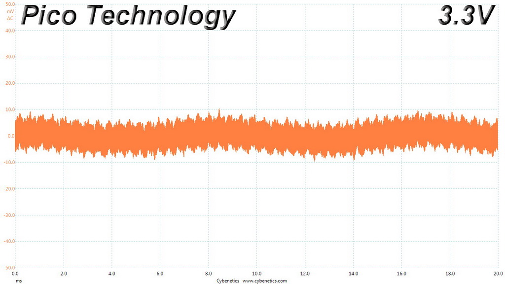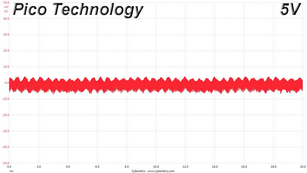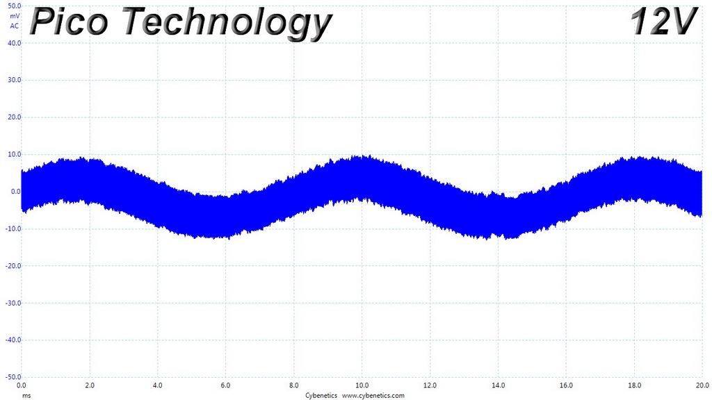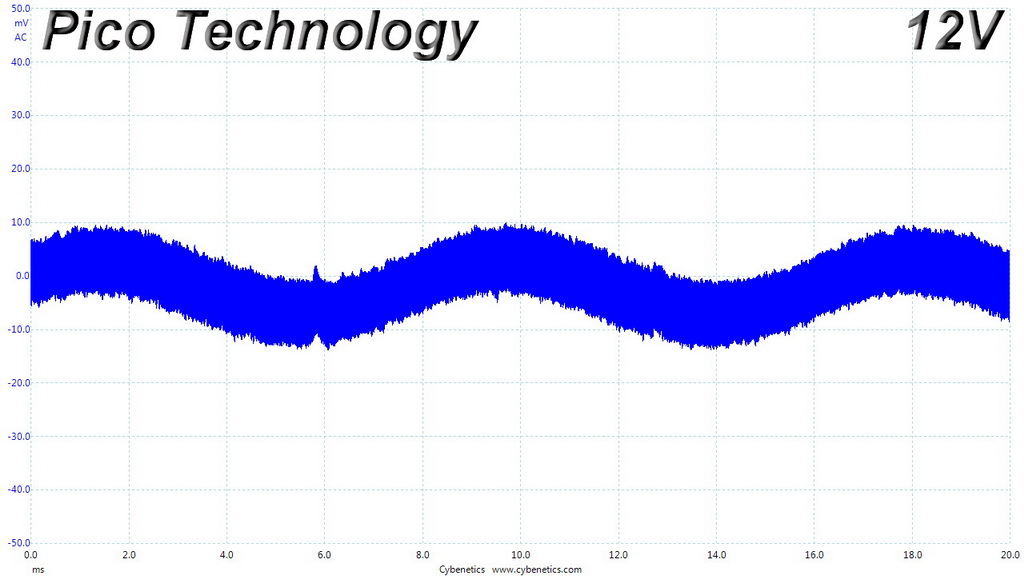The following oscilloscope screenshots illustrate the AC ripple and noise registered on the main rails (+12V, 5V, 3.3V and 5VSB). The bigger the fluctuations on the screen, the bigger the ripple/noise. We set 0.01 V/Div (each vertical division/box equals 0.01V) as the standard for all measurements.