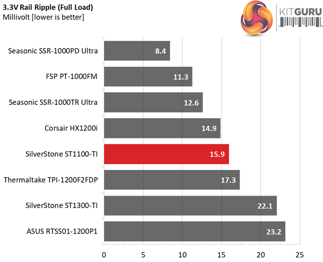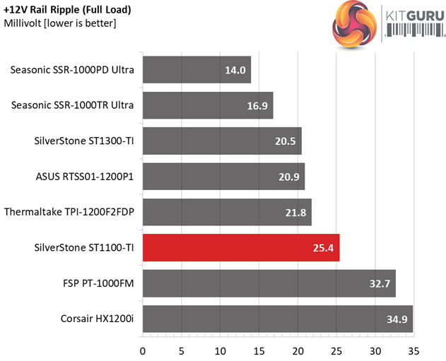 The ripple suppression is very good. Only when we pushed the PSU beyond its limits did we see the +12V rail go south, and besides a huge voltage drop, it also failed to keep ripple in control.