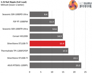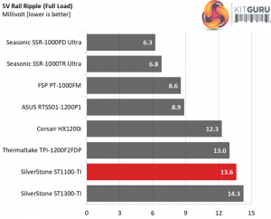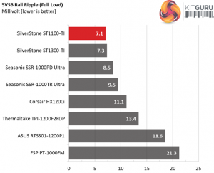 The following table includes the ripple levels we measured on the ST1100-TI’s rails. The limits, according to the ATX specification, are 120mV (+12V) and 50mV (5V, 3.3V, and 5VSB).
