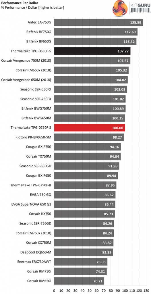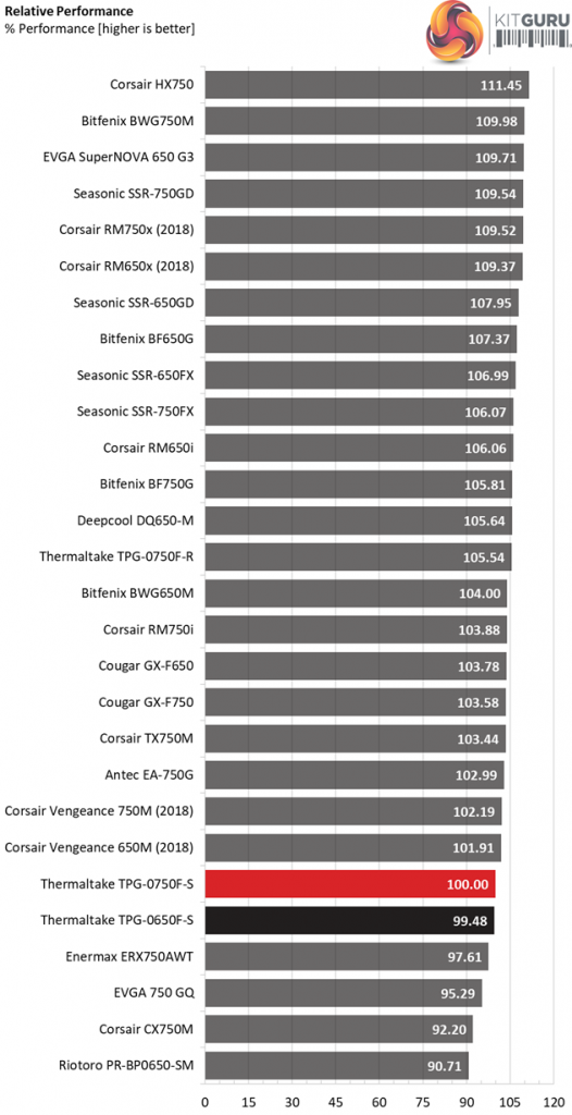 The following graph shows the TPG-750AH3FSGR’s total performance rating, comparing it to other units we have tested. To be more specific, the tested unit is shown as 100 percent, and every other unit's performance is shown relative to it.