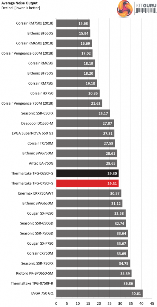 The overall performance is not that high, with the RM750x and the SSR-750FX being far away. The 650W model follows closely the 750W unit.