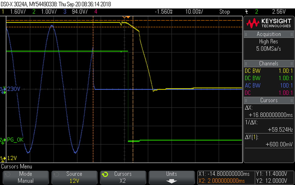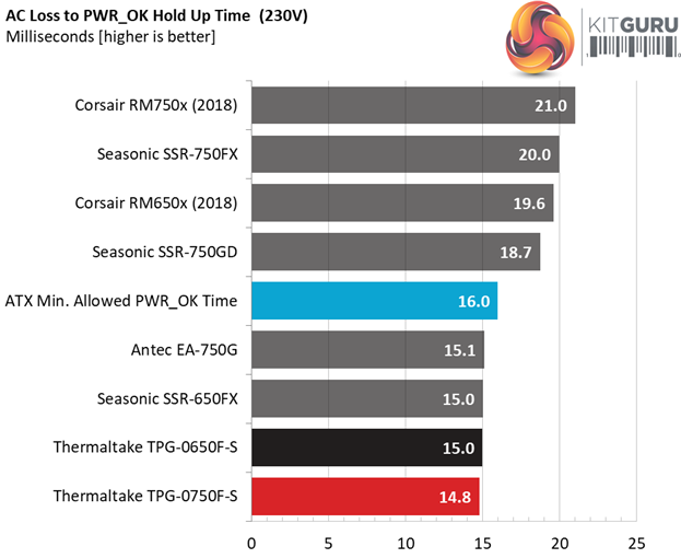 The hold-up is very close to 17ms, with the power ok signal needing 1.2ms to reach 16ms, which is what the ATX spec requires. At least it is accurate (the power ok signal).