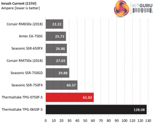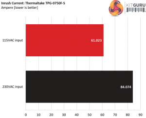 We measure high inrush current with both voltage inputs. What make us wonder here is the sky high inrush reading of the 650W model.