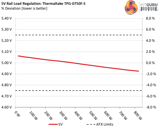 The first set of tests reveals the stability of the voltage rails and the TPG-750AH3FSGR’s efficiency. The applied load equals (approximately) 10 to 110 percent of the power supplies maximum load in increments of 10 percentage points.