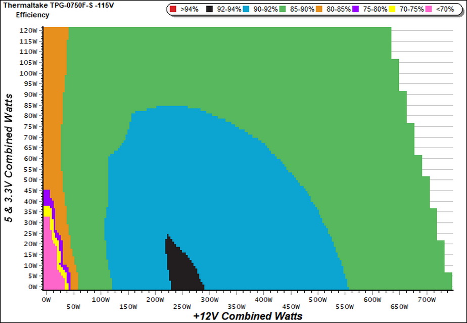 There is a small region with the efficiency going over 92%. This is something that we usually see in units with higher efficiency certifications (e.g. Platinum).