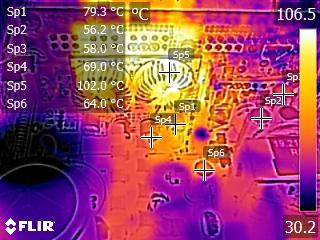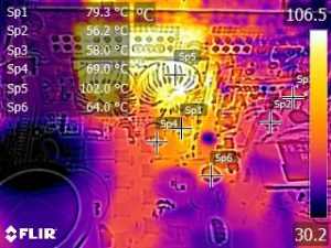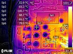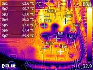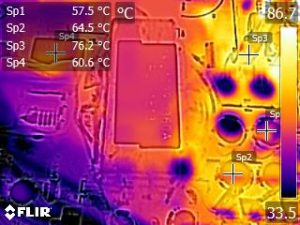 We apply half-load for 10 minutes with the PSU’s top cover and cooling fan removed before taking photos with our modified FLIR E4 camera that delivers 320×240 IR resolution (76,800 pixels).