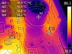 The temperature of the bulk cap stays low, however the VRMs get quite hot since we apply more than 10 Amps load in each of the minor rails. The temperatures of the polymer caps on the VRMs' daughter-board are increased as well, but this type of caps are tolerant to high temperatures.