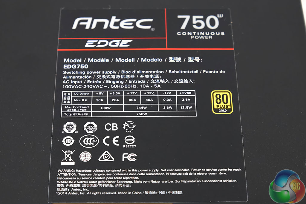 The Antec EDGE is a dual +12V rail power supply. Each of the unit's +12V rails can deliver 40Amps of power. The minor rails can each deliver 20A.