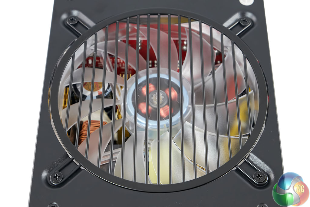 The top of the power supply is home to a large, clear fan – resting behind a metal grill. We will look at the fan more closely when we open the unit.
