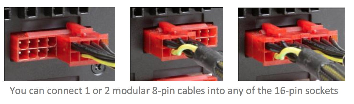 You can connect one or two modular 8 pin cables into any of the 16 pin sockets.