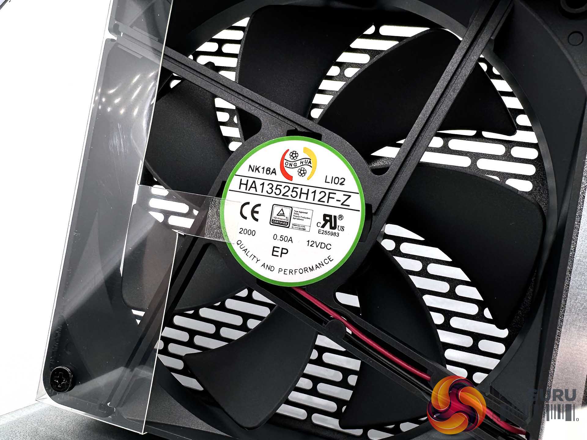 The unit (as expected) uses a Hong Hua fan – the HA13525H12F-Z in particular. This is a high quality FDB fan (Fluid Dynamic Bearing) fan rated 0.50A, 12VDC. These fans can be bought for around £15 online now – a quality fan, rated to 2,300rpm maximum rotation.