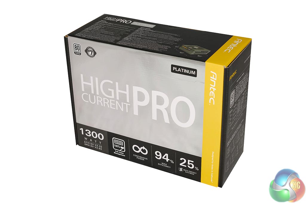 The Antec High Current Pro Platinum 1300W ships in a large box highlighting most of the main selling points. Ideal for a retail store environment.
