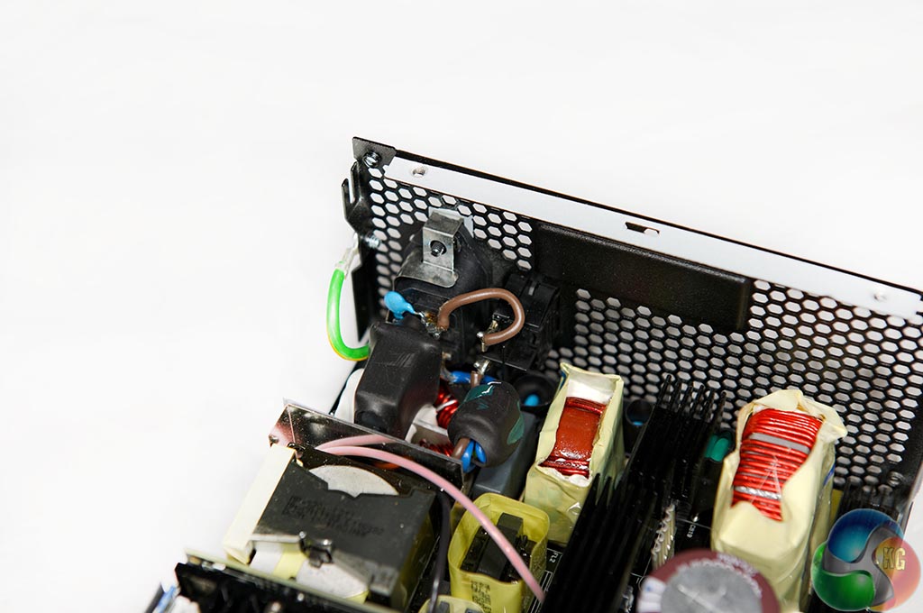 The first section of the transient filtering stage is behind the AC receptacle. It consists of two Y caps and a single X cap. The main PCB is home to the remainder of the transient filtering components, including four Y caps, a single X cap, an MOV and two CM chokes.