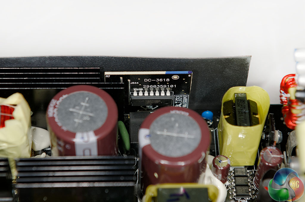 The three layered modular PCB contains a series of Chemi Con electrolytic capacitors to help with ripple filtering to the DC outputs. Two DC-DC converters which generate the minor rails are on a PCB which is placed close to the modular PCB.