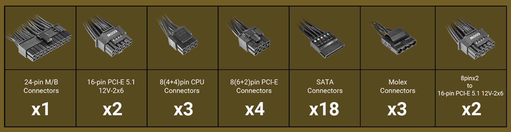 The cables are all high quality and individually sleeved, offering reassuring quality for a power supply at this hefty asking price. Cables are all between 16-18AWG. The 12+4 Pin PCIe (600w) cables are 16-24AWG, and there are two of them.