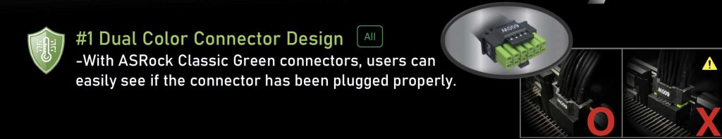 In the efforts to help end users be assured their cables are plugged in correctly, ASRock have coloured the connector parts green – as the diagram above shows, this ensures you can see if they are seated properly before turning on the system. A pretty neat idea, but we imagine most people may not even realise.