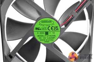 The ROG Strix 1000 Watt supply that we received has an EverFlow fan inside it, model number F1214025BL, rated 12V 0.2 AMP. This is a Double ball bearing fan made in China and has a maximum rotational speed of around 1,600 rpm to produce 74CFM. I don't know much about this fan or have previous experiences – its the first time I have seen one to be honest. I was a little surprised to see that ASUS did not opt for a better known Fluid Dynamic bearing fan in such a high end design.
