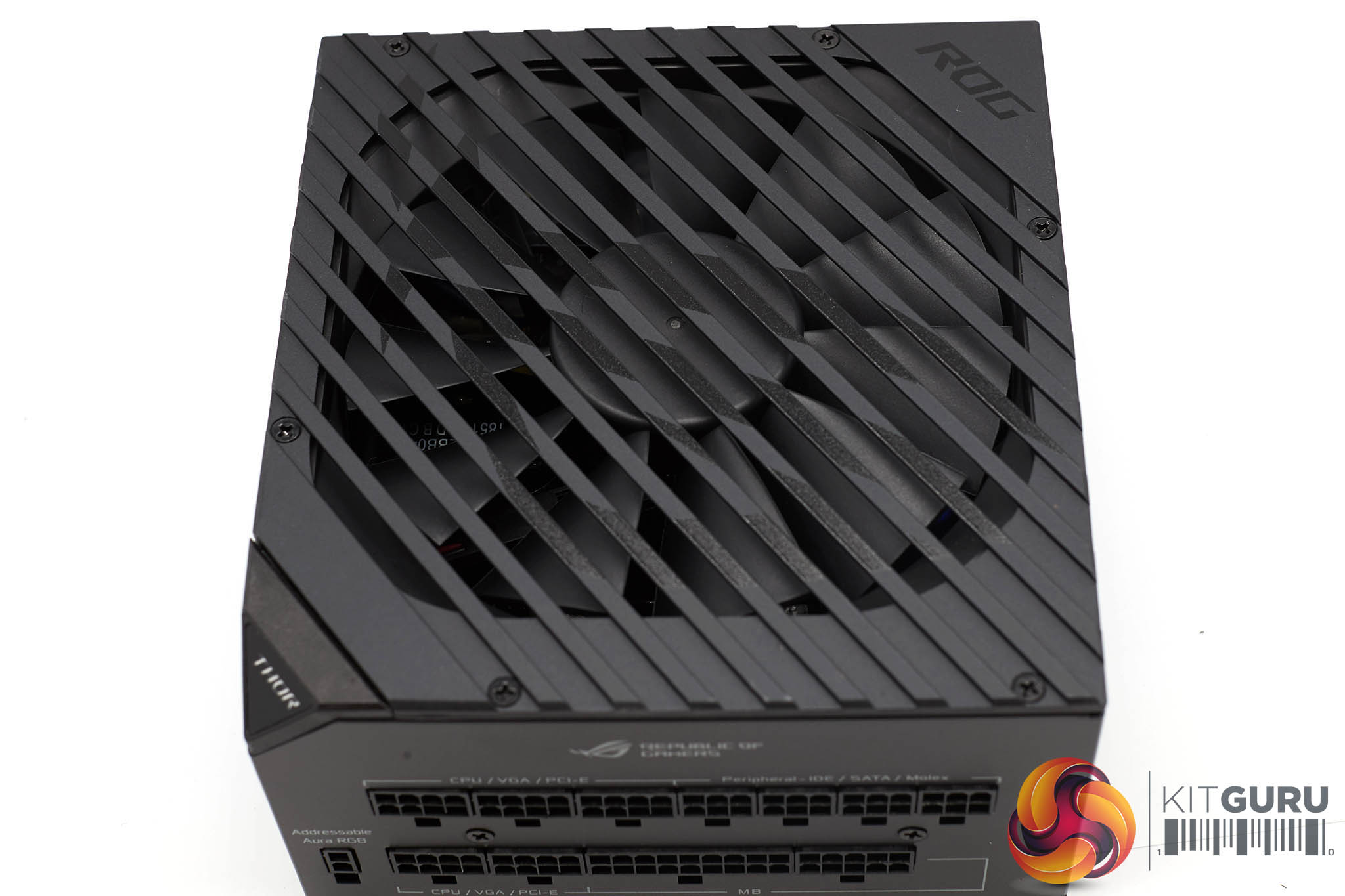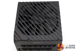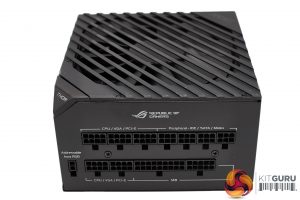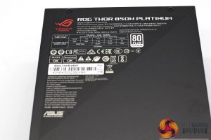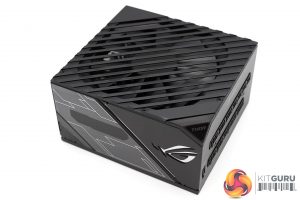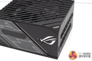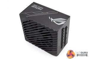 Built to take a beating. The ROG logo is clearly seen on the side. The 850W model is slightly smaller than the 1200W model we reviewed last year. It measures 160x150x86mm (the 1200W model is 190x150x86mm). This means it will fit easier into a wider array of cases. We can see the LED screen on the side – this displays the power you are using when it is running.