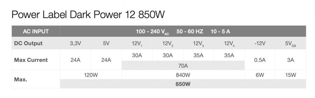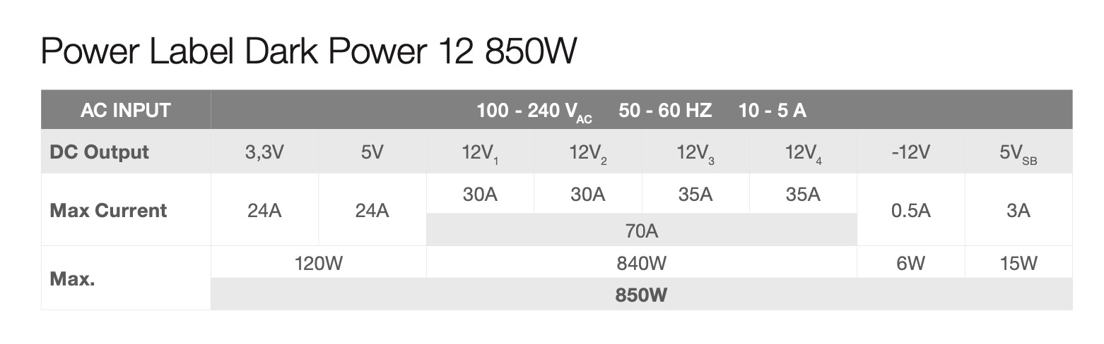 The 850W power supply in this range is capable of delivering 70A across the 12V rail for a total of 840 watts. Enough for any single GPU based system today.