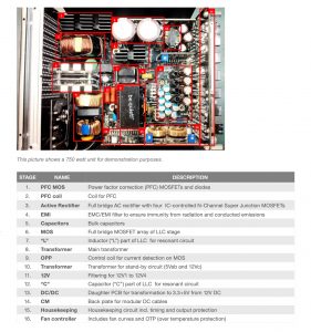 This is a block diagram of this specific design. The Dark Power 12 has a bridge rectifier on the AC side utilising four N-Channel Super Junction MOSFETs, controlled by four controller ICs, called CMDRBR. This helps the supply to reach the lofty heights of Titanium efficiency. Full Bridge is the number of MOSFETs used in the PWM stage (no 4 in the block diagram above). The MOSFETs are responsible for creating high frequency alternating current, which gives high levels of efficiency for the main transformation.