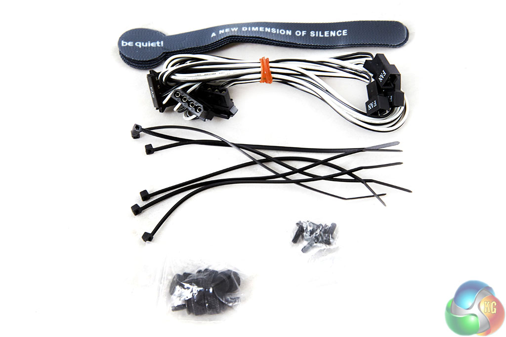 be quiet! include a nice accessory package including plastic and felt cable ties, screws and external fan headers. The overclocking key (above left) allows the end user to switch between single and multi rail 12V modes. There is also an overclocking jumper in the bundle.