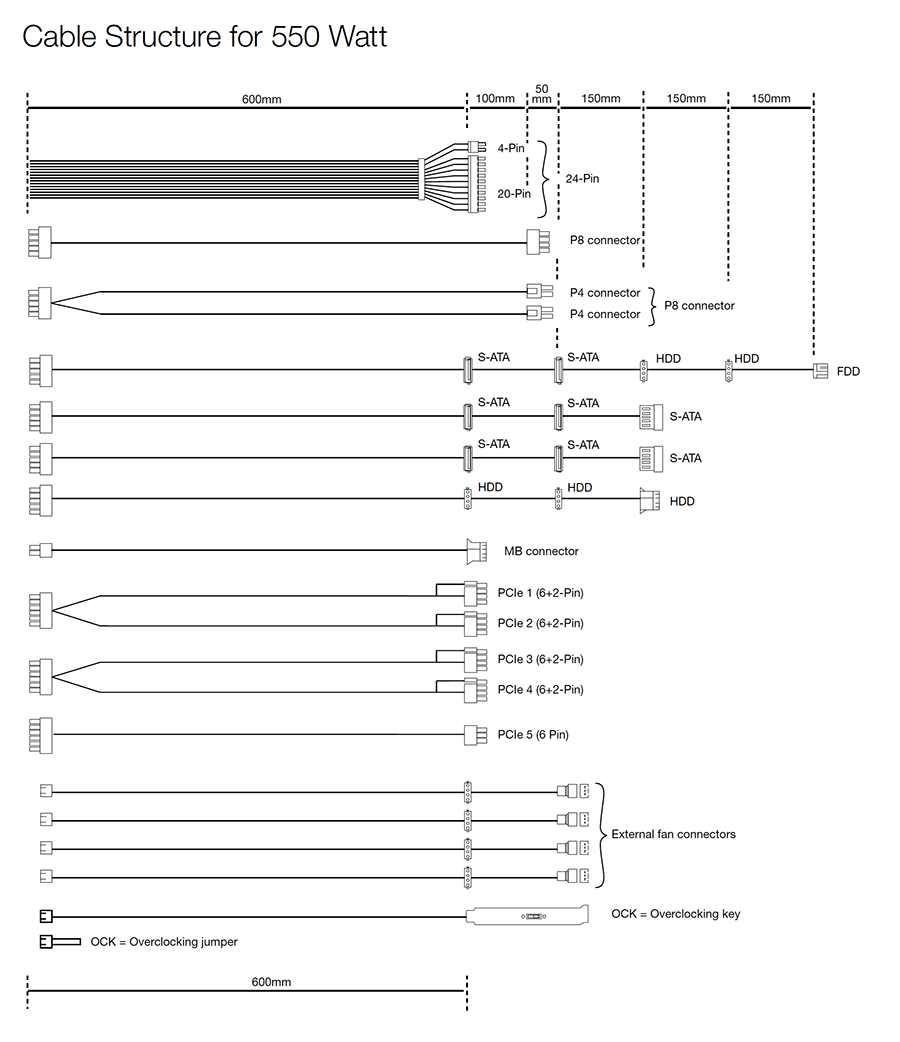 be quiet! have equipped the 550W power supply well, including two PCI e cables with two 6+2 headers on each. Another cable is included with a single 6 pin header – for those users running with a lower end solution who want to keep cable routing as neat as possible.