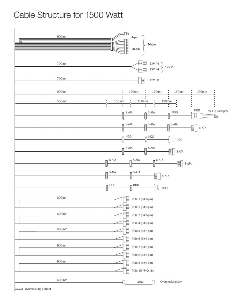 Yes, you saw it right – this power supply has support for up to 10 PCI express connectors. 16 SATA connectors, 1 P4+4/1xP8, and 8 Molex.
