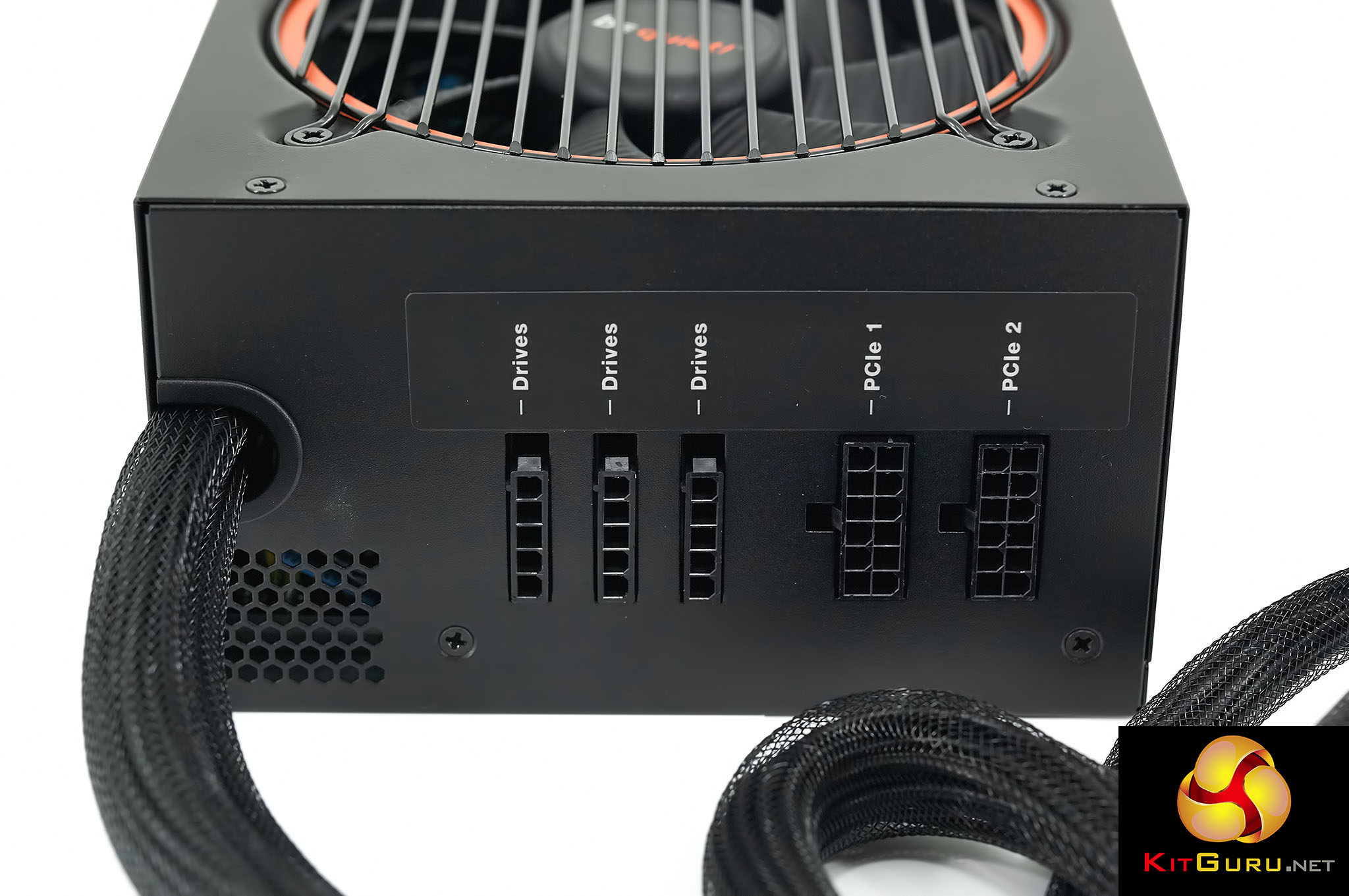 The other side of the unit is home to the modular connector bay and the hardwired cables. The modular connectors are cleanly laid out vertically with the names above them in white – for high contrast clarity during the build phase. The PCI connectors are dual width so you won't accidentally plug them into the wrong connector.