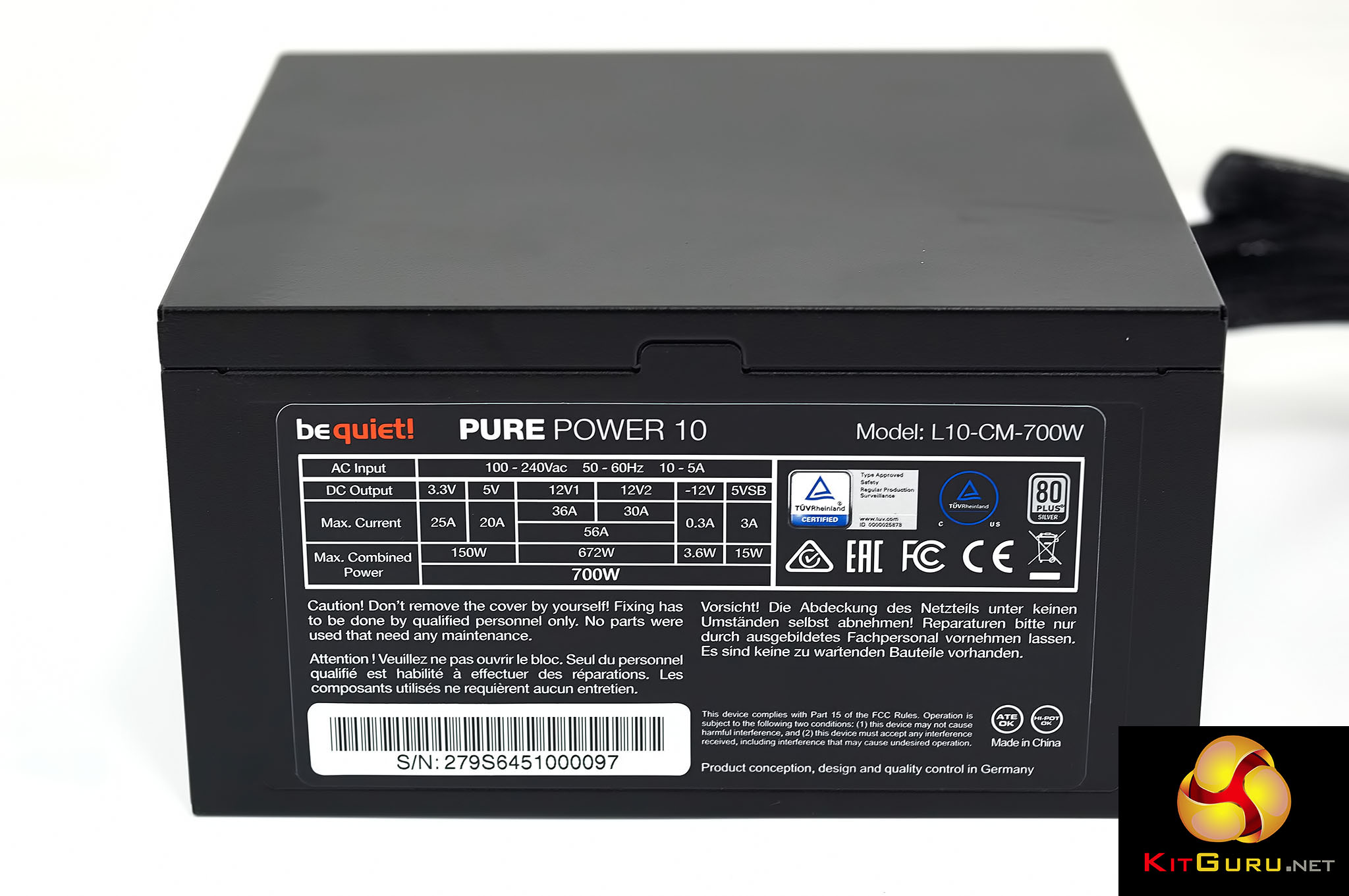 The be quiet! Pure Power 10 700W CM can deliver 56A across the two +12V rails which translates into 672w of the 700w available. The 12V1 rail handles the 24 pin, drives, and PCIe 1 and 2 connectors. The +12V2 rail handles the P4+4 and the PCI e 3+4 connectors.