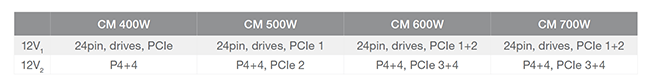The other side of the power supply is home to the modular connector bay and the hardwired cables. The modular connectors are neatly laid out horizontally with the names above them, in white. The PCI connectors are dual width so impossible to mix up with the peripherial connectors.