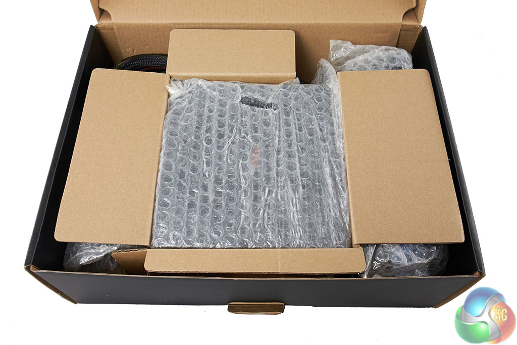 The power supply is protected inside thin bubblewrap with cardboard spacers on all sides. The accessories are separated into sections inside the box.