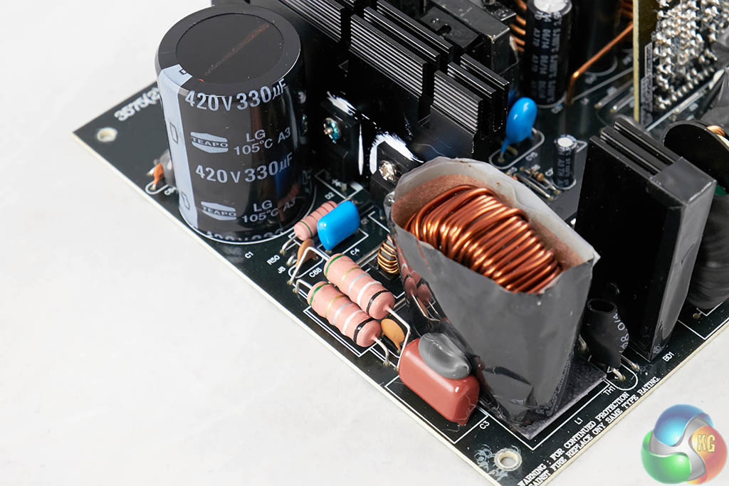 The design is using a Chinese TEAPO capacitor in the primary stage. It is rated 420V 330uF @ 105C. We were a little disappointed to note that be quiet! didn't instruct the OEM to use a higher grade Japanese capacitor (Nippon Chemi Con, Rubycon etc) for the primary stage, but clearly they are working to fairly tight margins. Second side capacitors are also Chinese 105c rated.