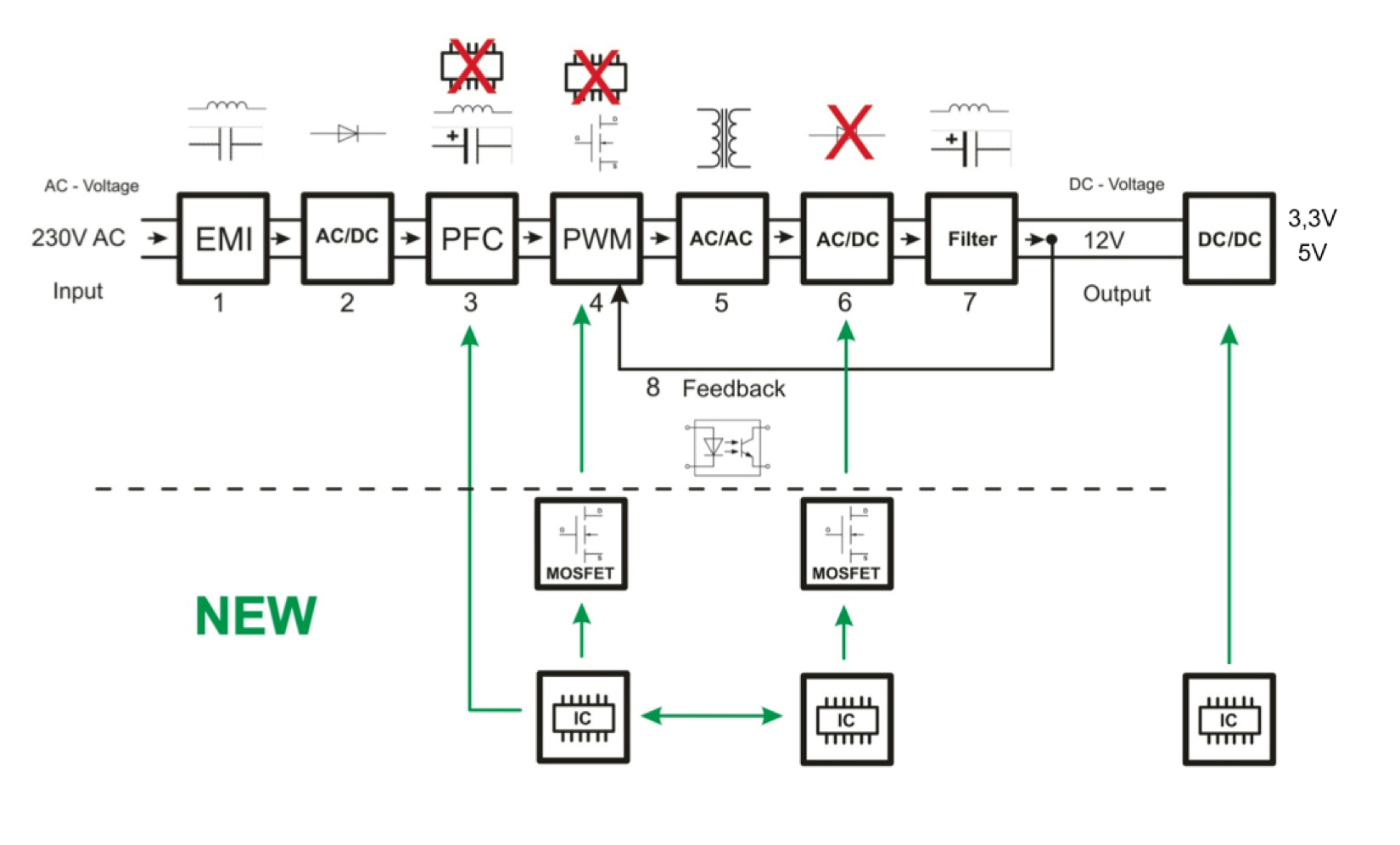 This uses IC controllers instead of older style passive components, so the power conversion is constantly monitored and always being kept at optimal efficiency level. Active Clamp + SR is a cost effective topology to create power supplies with an 80 PLUS Gold certification in Watt ranges up to 800 Watts.