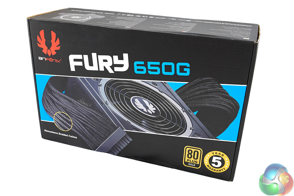 The BitFenix Fury 650G power supply arrives in a brightly coloured box with blue accents.