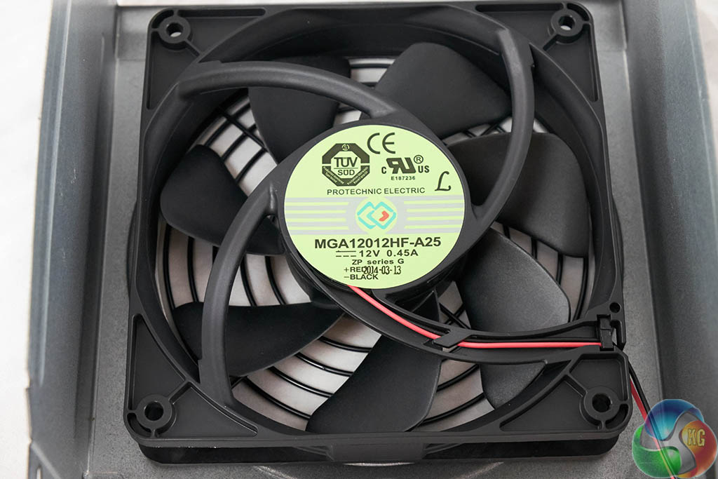 Inside is a Protechnic Electric fan (Model Number: MGA12012HD-A25). This is a quality fluid dynamic bearing fan rated at up to 2,400 rpm, 84.8CFM. This fan should last a long time, based on the high grade bearing technology.
