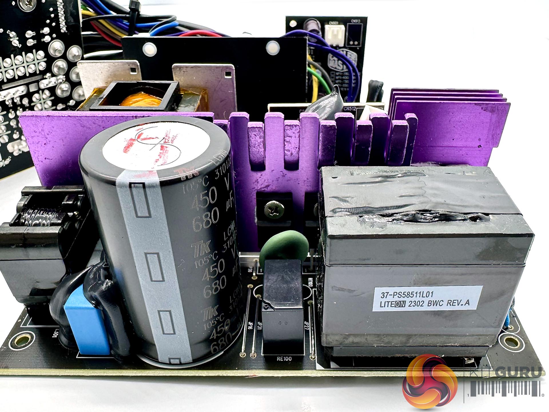 As we can see from the images above the design incorporates purple ‘anodised' heatsinks which certainly stand out – if the end user would ever have the unit apart in the real world that is. The main capacitor is rated 450 V 680uF at 105c. The TK stands for Toshin Kogyo Co. Ltd, and from what I know they are Japanese capacitors from quality sources.
