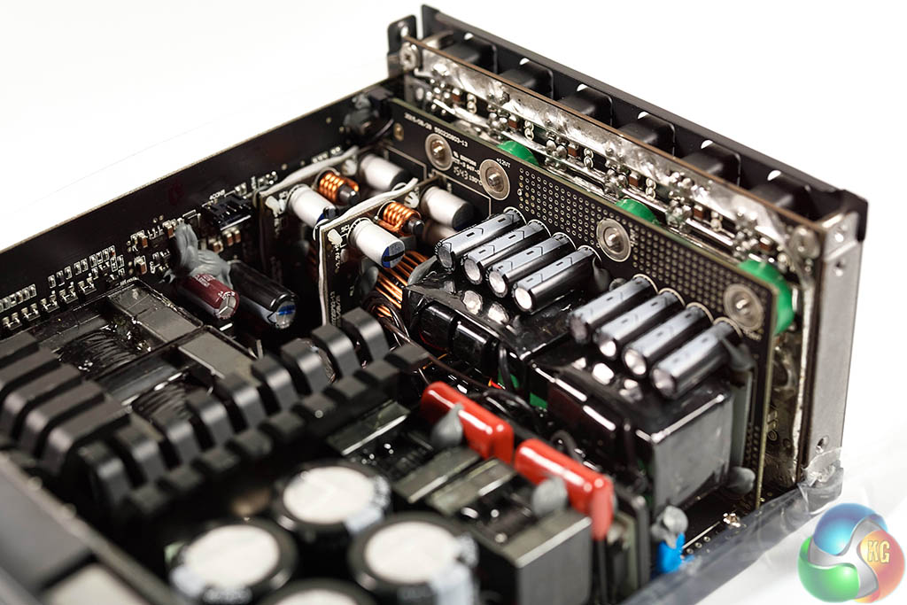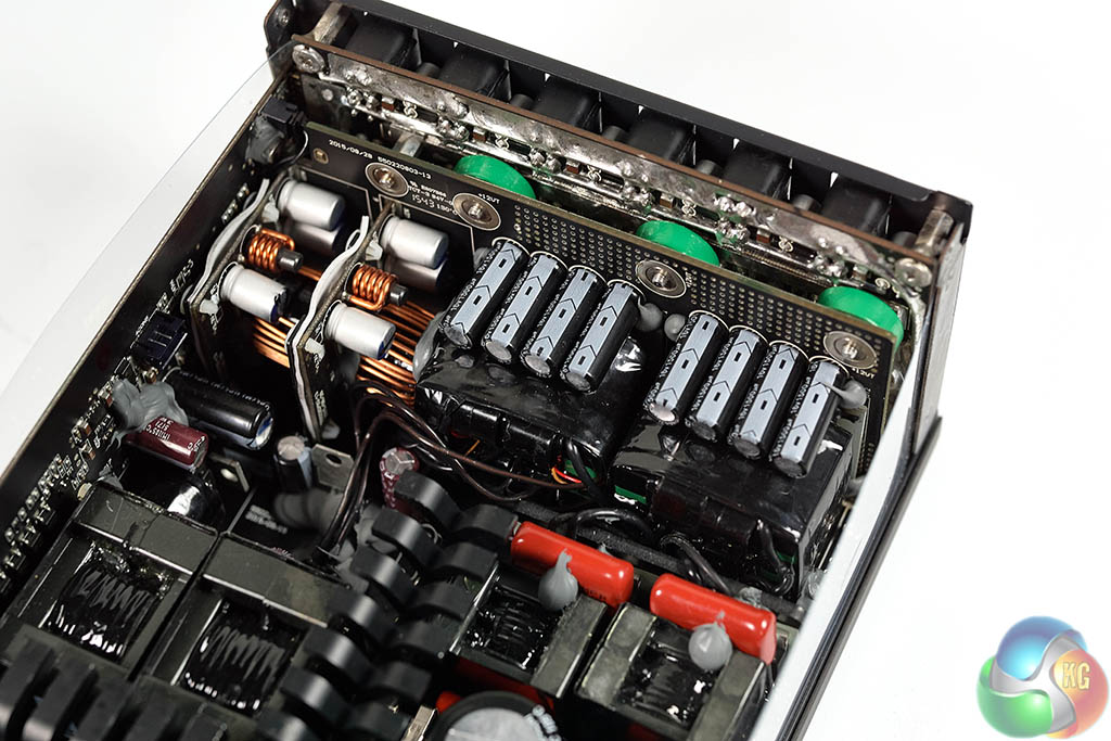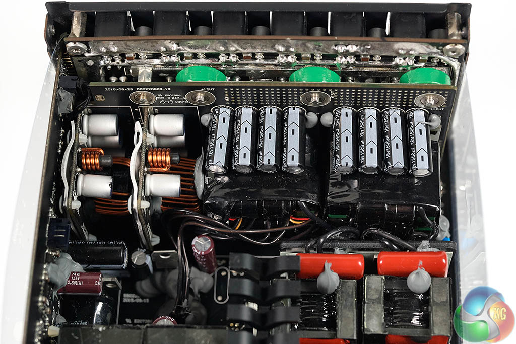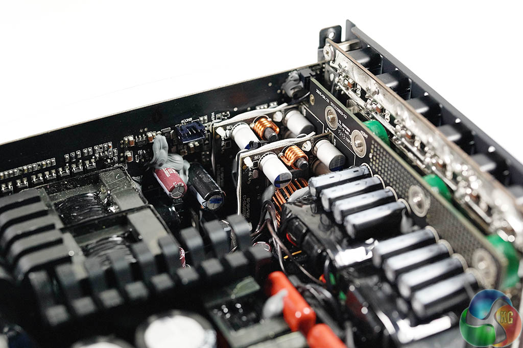 The primary side incorporates an APFC converter as well as full bridge topology – and two DC-DC converters generate the minor rails. FETS to regulate the +12V rail are installed on a little board set close by to the main transformers.
