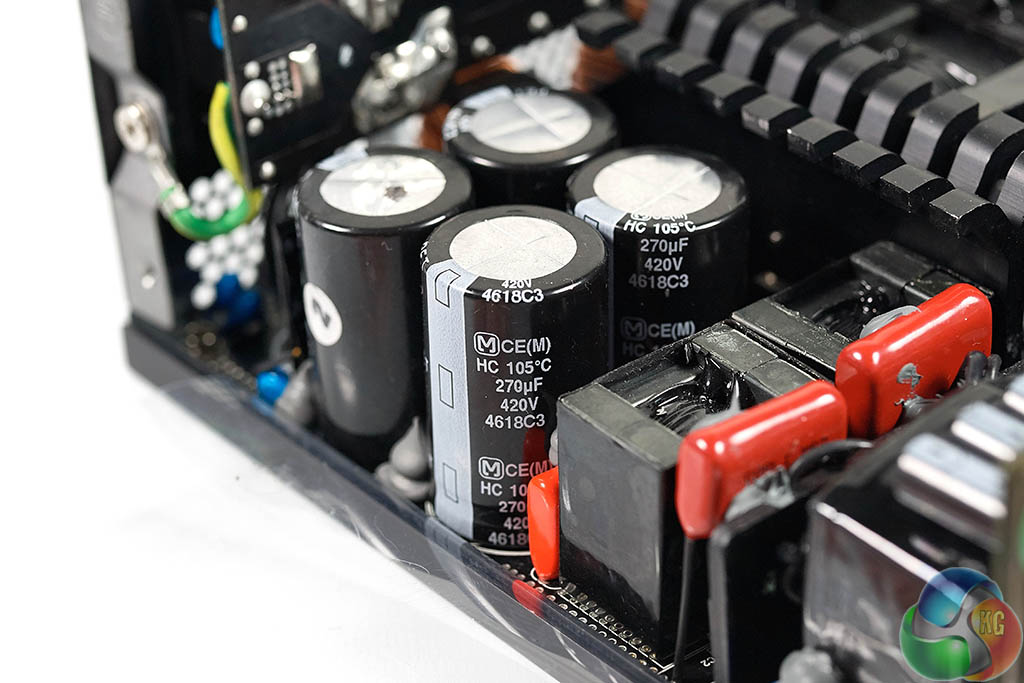 As the images above show, the design of this power supply is very condensed, there is very little room for airflow. We noticed that Cooler Master have positioned the bulk caps and the electrolytic capacitors on the secondary side to get some air flow, which was wise.