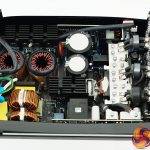 We found capacitors from Nippon Chemi Con and Rubycon throughout the power supply – all high grade Japanese models. We noticed that the standby and PFC control board has two fuses – one for the board and the other for the line input. Primary stage capacitors are made by Nippon Chemi Con and rated 420V 830uF and 420V 620uF (Total 1450uF). As a comparison , the Kolink Continuum 1200 watt supply we reviewed last week has a total of 940uF combined (HERE)).