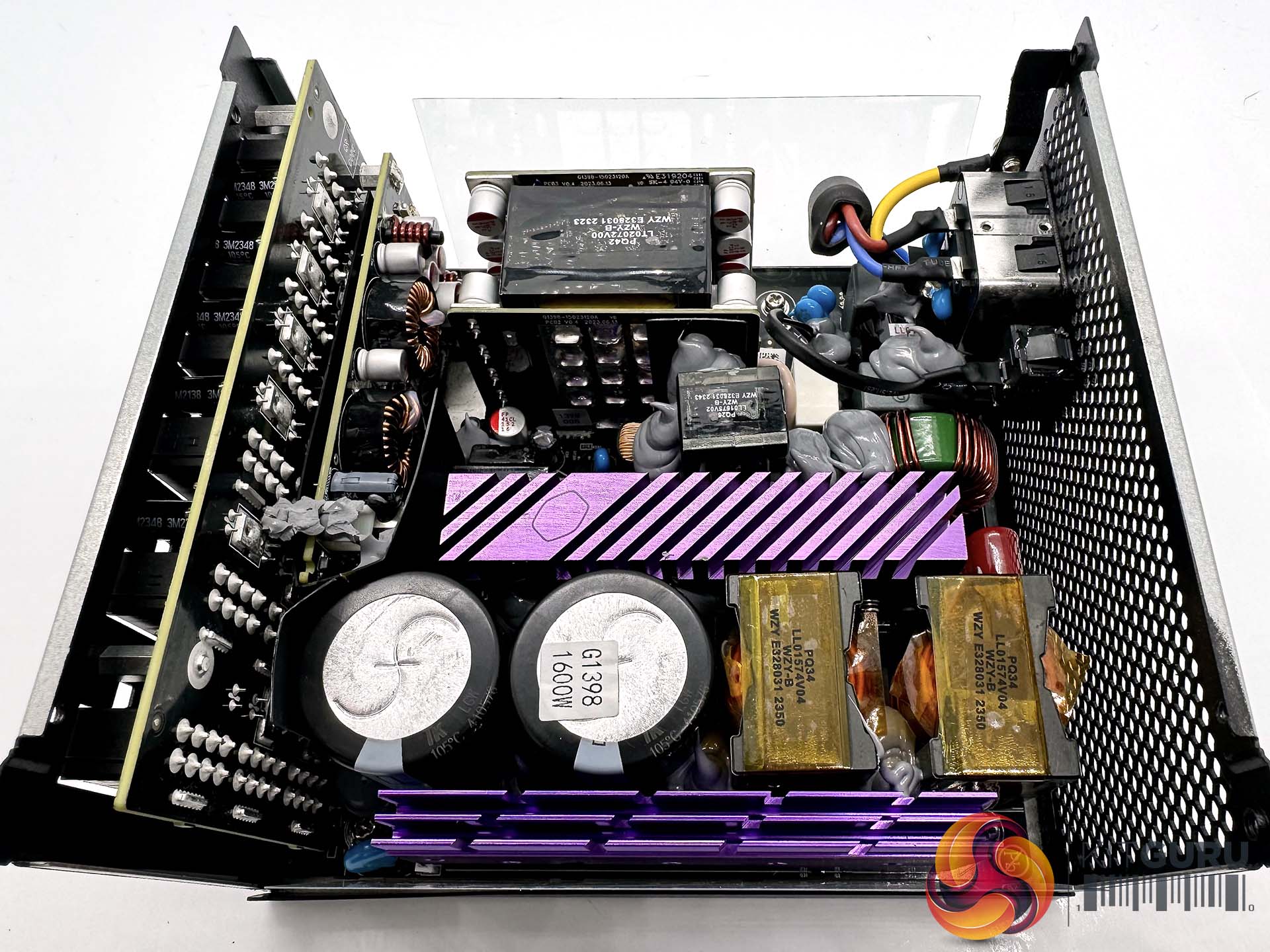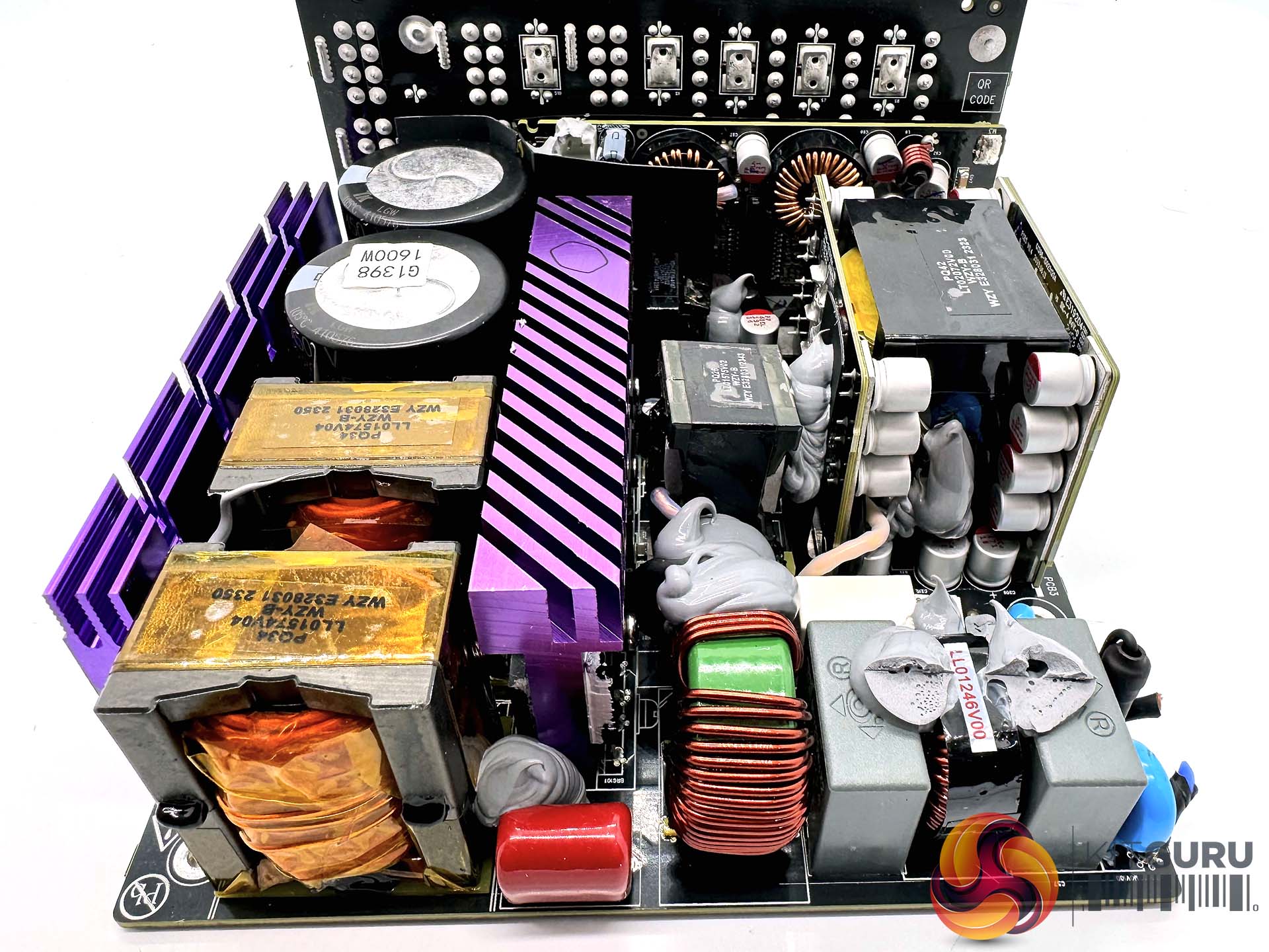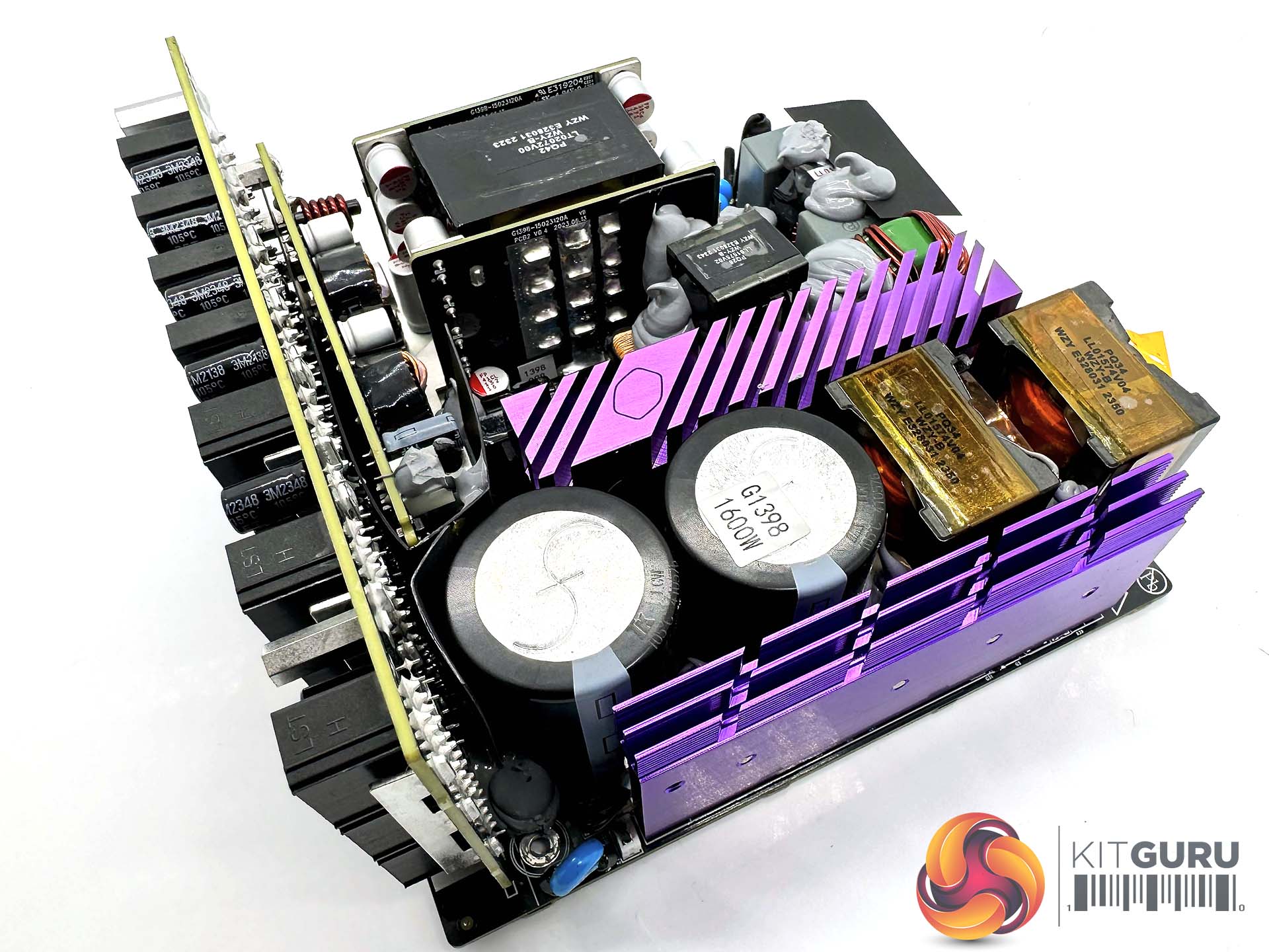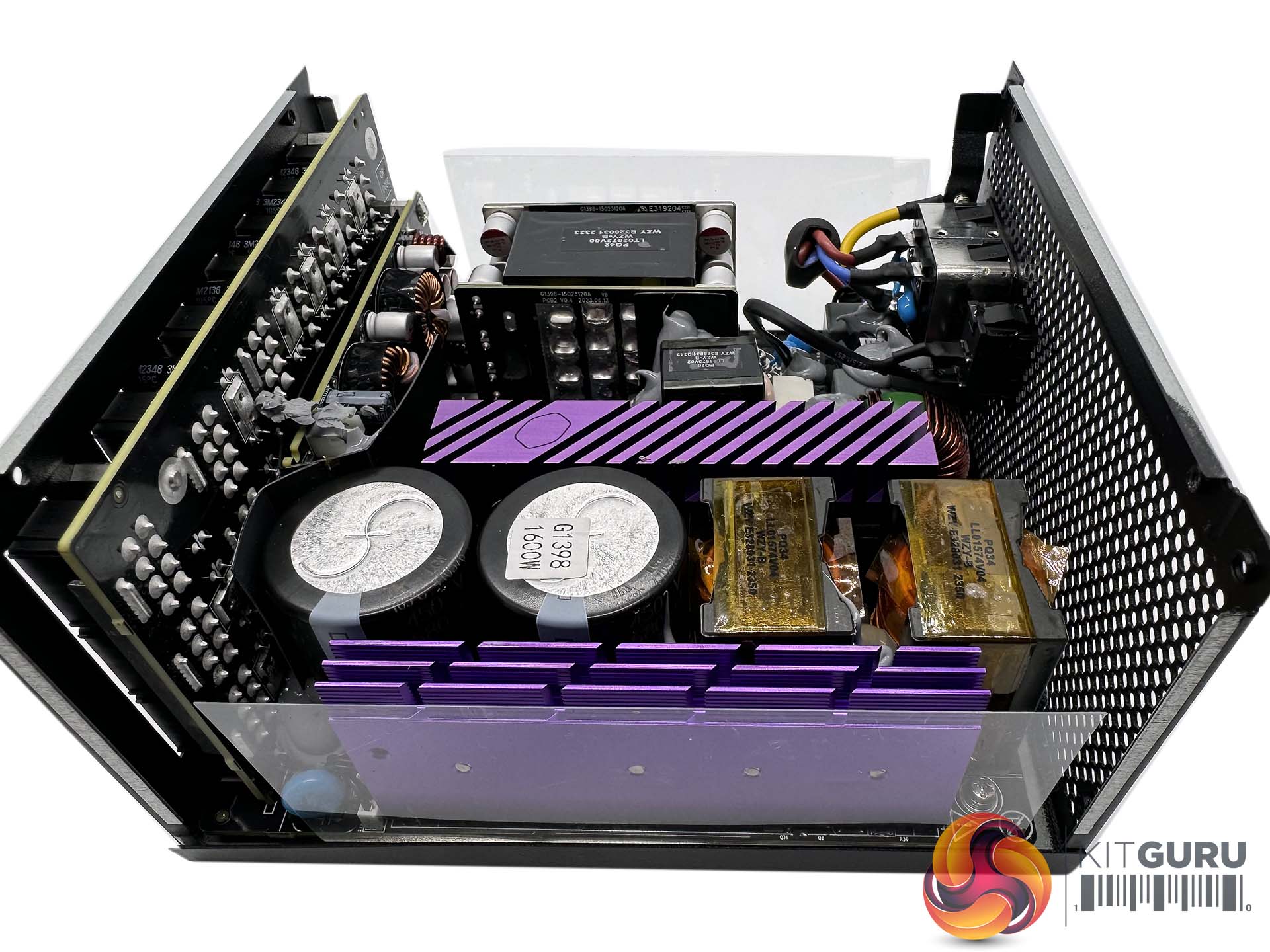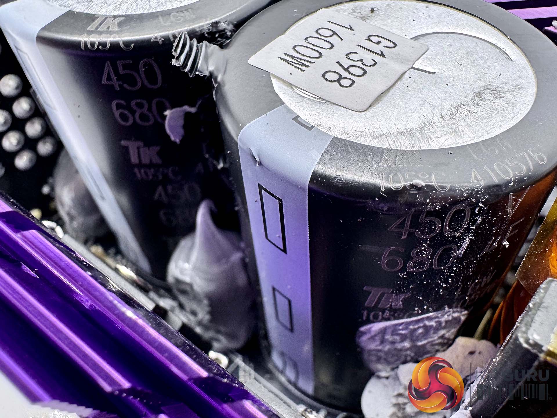Cooler Master's capacitors of choice in this unit are Toshin Kogyo, otherwise more widely known as TK. The two primary capacitors are 105C rated, 650V 680uF each for a total of 1360uF.