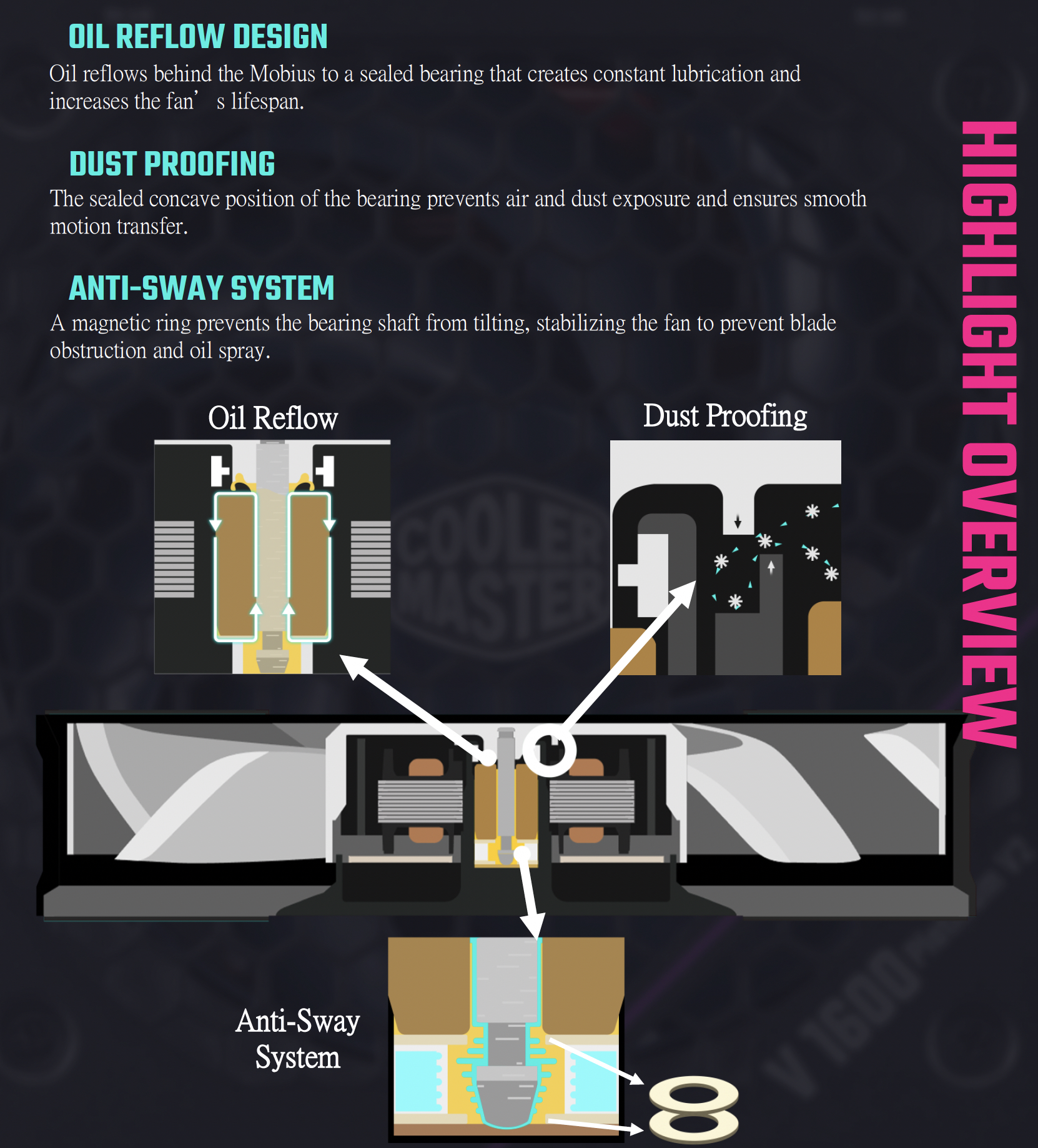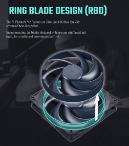 Cooler Master ‘Ring Blade Design (RBD)' diagrams are shown here, from the company themselves (above). They claim the interconnecting fan blades are designed in house and are reinforced for ‘stable and concentrated airflow'. We have seen a lot of fans over the years so it's easy to get bogged down in buzzwords at times. Their life span is rated at 100,000 hours before failure.