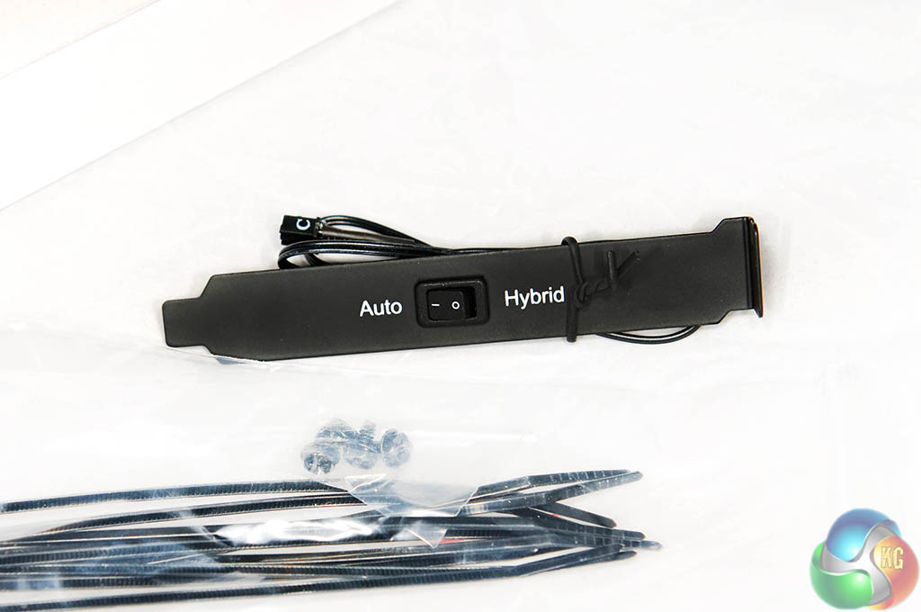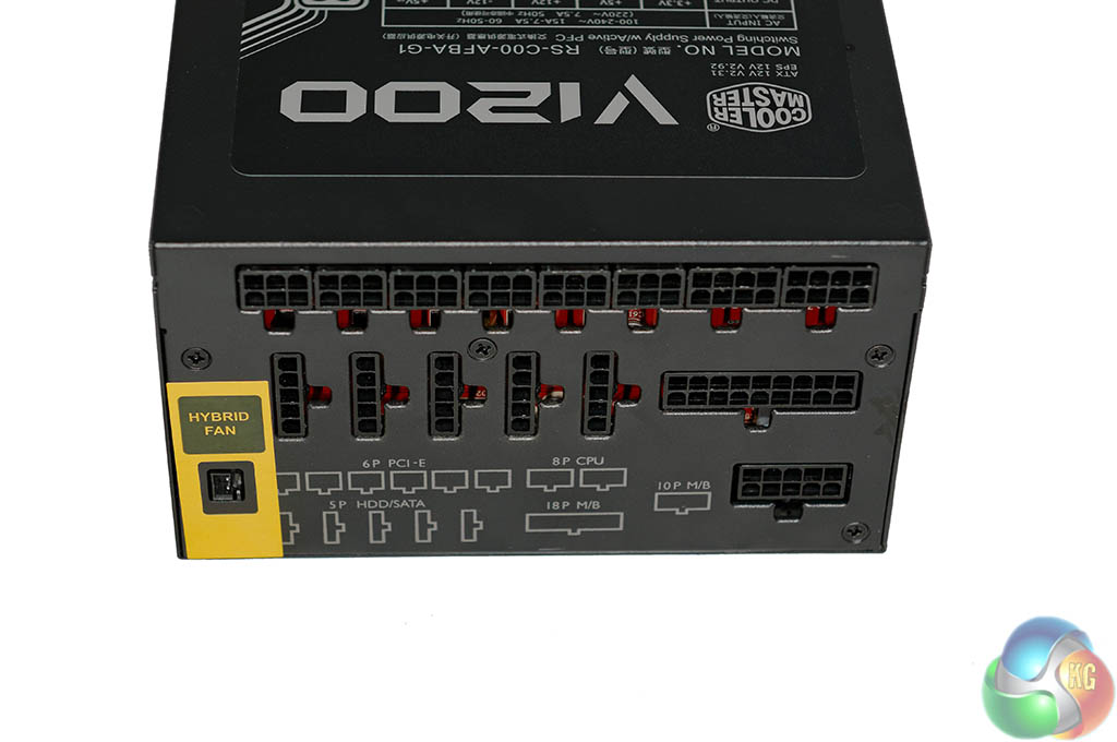 The other side of the power supply is home to the modular connectors. Cooler Master place a removable yelllow sticker on one corner marked with ‘hybrid fan'. The controller attaches directly here. All of the connectors are clearly labelled to make the build process as straightforward as possible.